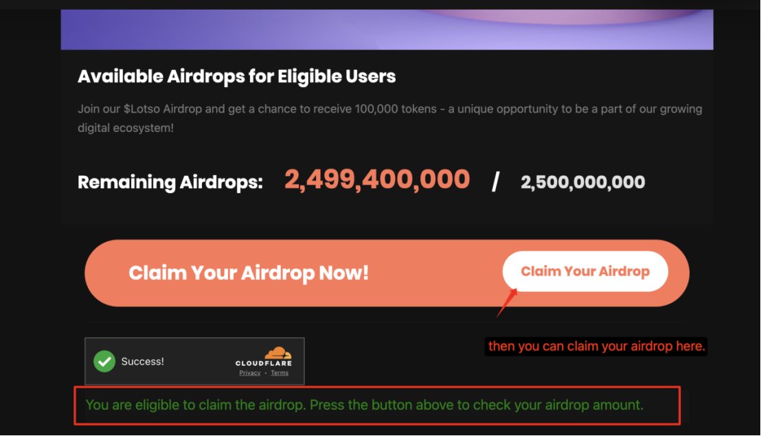 If you have the eligibility, you will be able to claim your own airdrop in the next time period. Website will show you hown long you can claim $Lotso. Patiently wait and claim.
